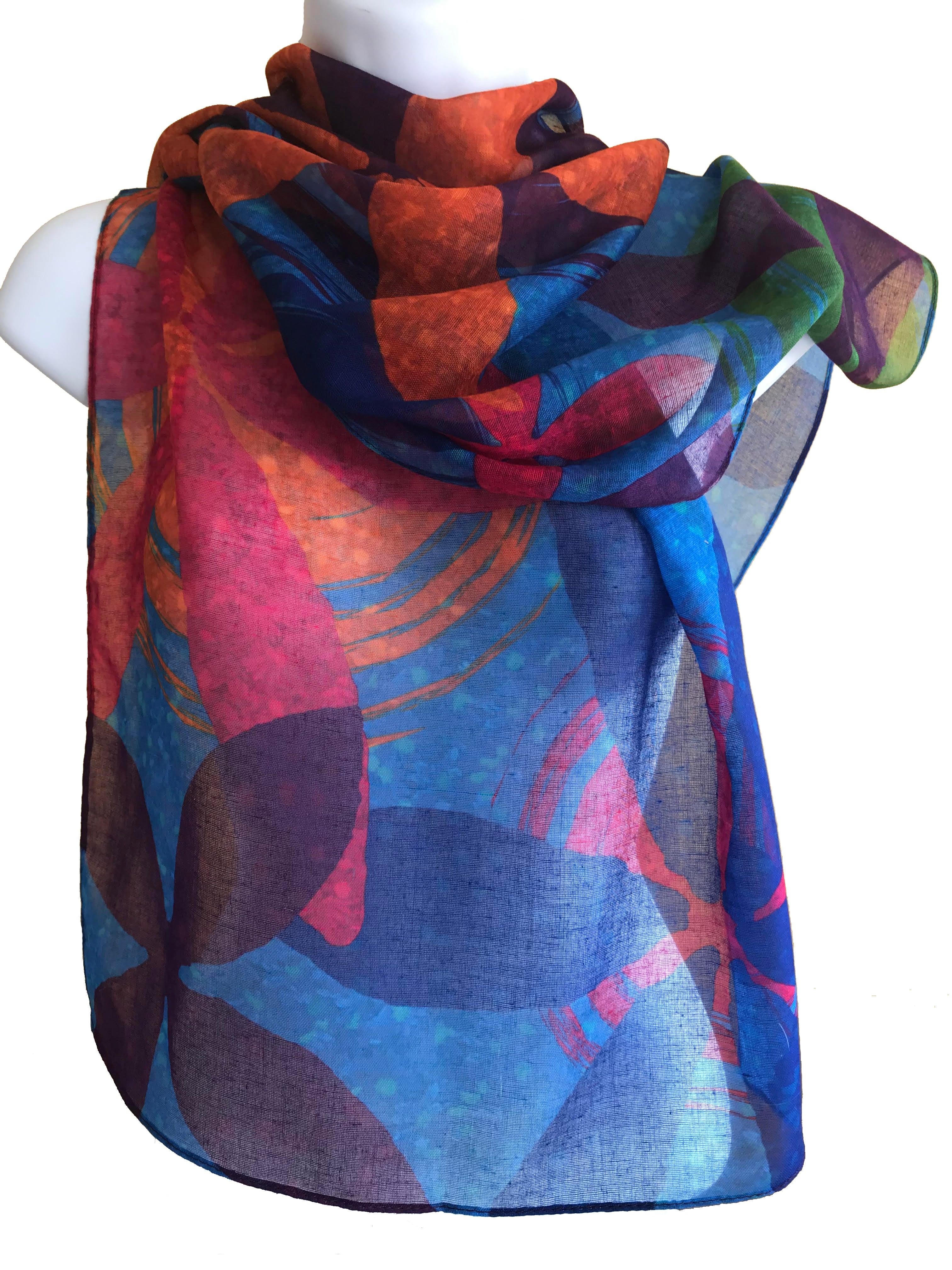 Je nachdem, wie Sie den Schal tragen, können Sie unterschiedliche Farbdetails zeigen. Schalhintergrund ist mit Lila, Fuchsia, Grün und Indigo blau.