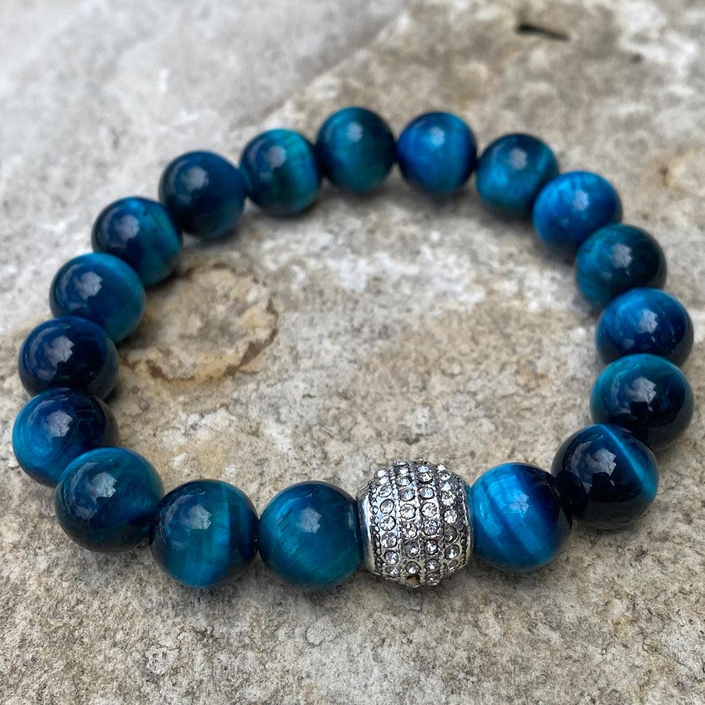 - Pulsera de cuentas de ojo de tigre azul de 12 mm con cordón elástico
