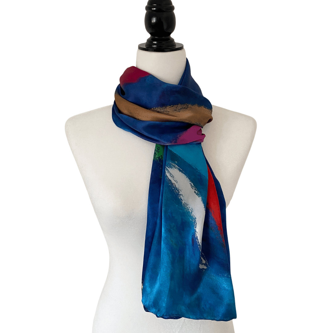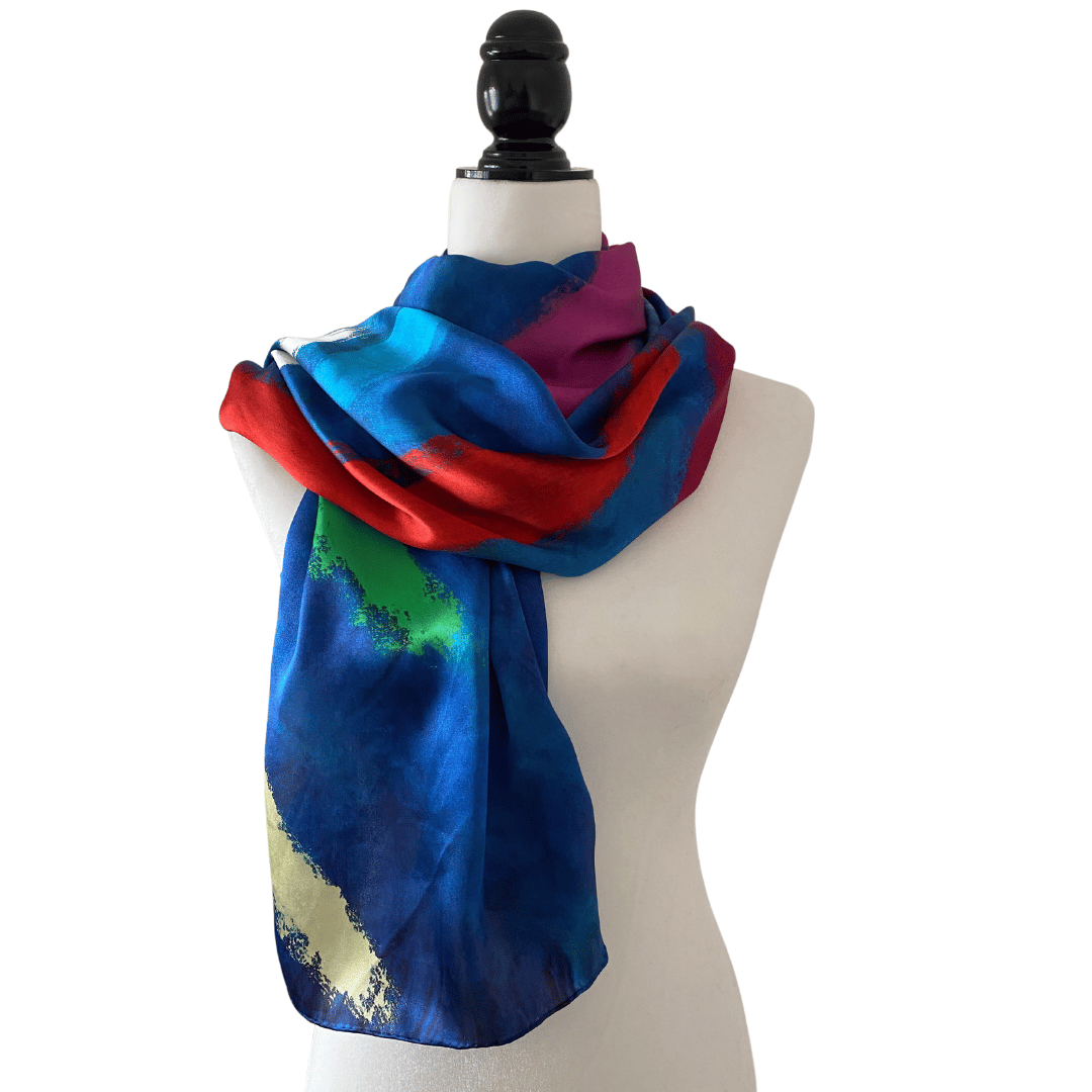 Les écharpes sont joliment emballées dans une boîte signature Jack Bush contenant une carte décrivant les détails de la peinture, l'artiste et l'entretien de votre écharpe
