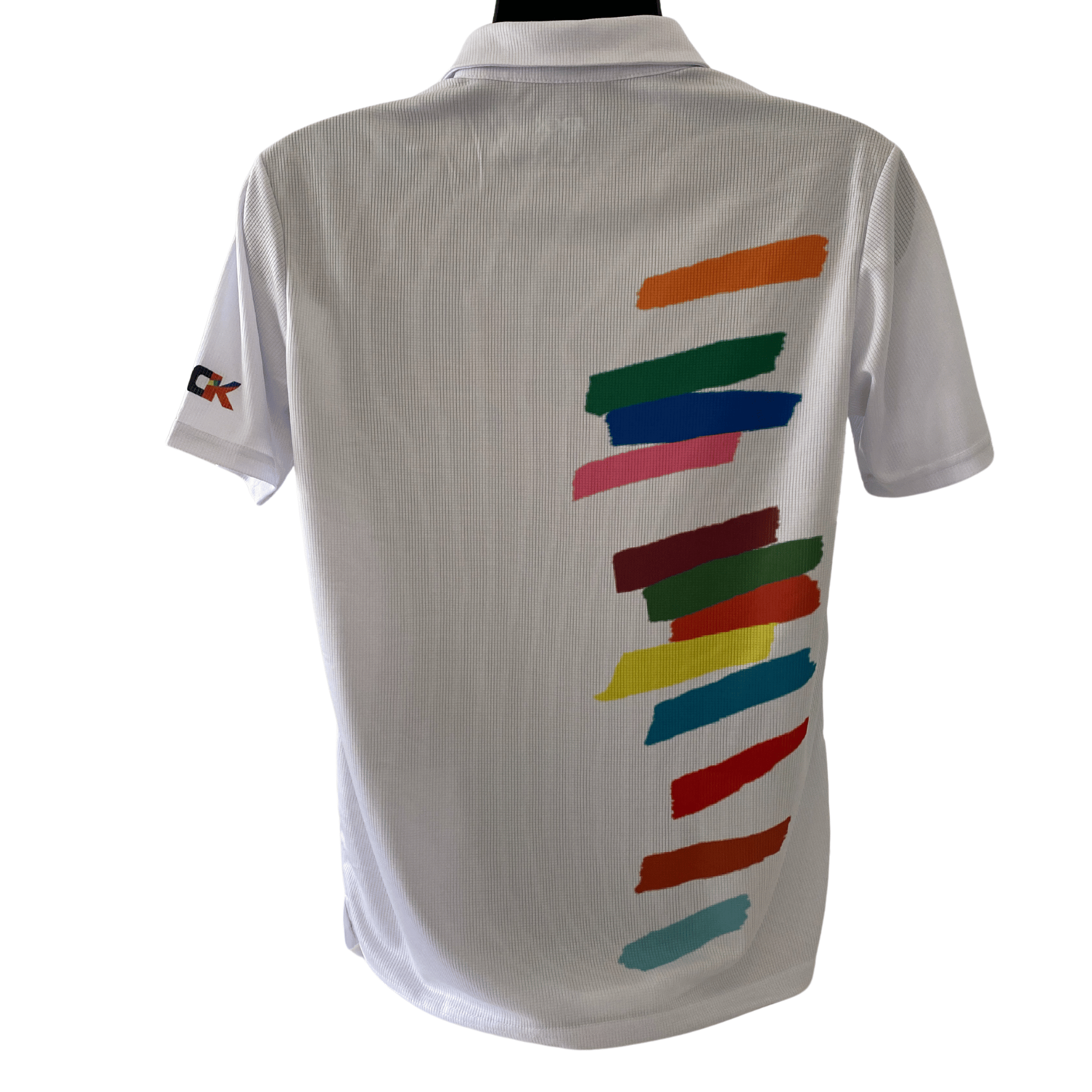 Our new collection of polos for men feature a quick-dry, sweat wicking fabric perfect for golfers. Complete and unique original design featuring art details from Jack Bush paintings. Three button collar detail with side splits. Lightweight with stretch for comfort.